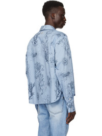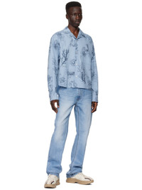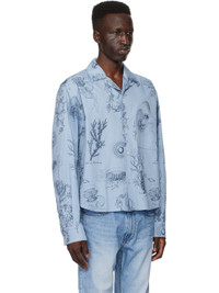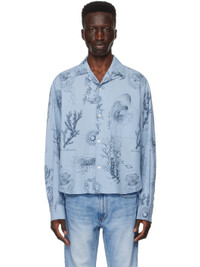 Cotton poplin shirt. Graphics printed throughout. · Open spread collar · Button closure · Flap pocket · Shirttail hem · Single-button barrel cuffs · Logo plaque at back collar Supplier color: Blue 100% cotton. Made in South Korea 241704M192019