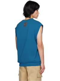 Knit wool vest. · Rib knit V-neck, hem, and armscyes · Embroidered logo patch at front hem · Leather logo patch at back collar Supplier color: Blue 100% wool. Made in South Korea 231704M206001
