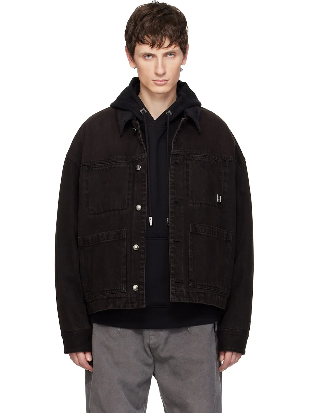 Insulated non-stretch denim jacket. · Fading throughout · Corduroy spread collar · Button closure · Patch pockets at front · Logo hardware at chest and back collar · Adjustable button tab at hem side seams · Buttoned barrel cuffs · Full quilted satin lining Supplier color: Mud Body: 100% cotton. Trim: 100% cotton. Fill: 100% polyester. Lining: 100% polyester. Made in South Korea 252704M180005