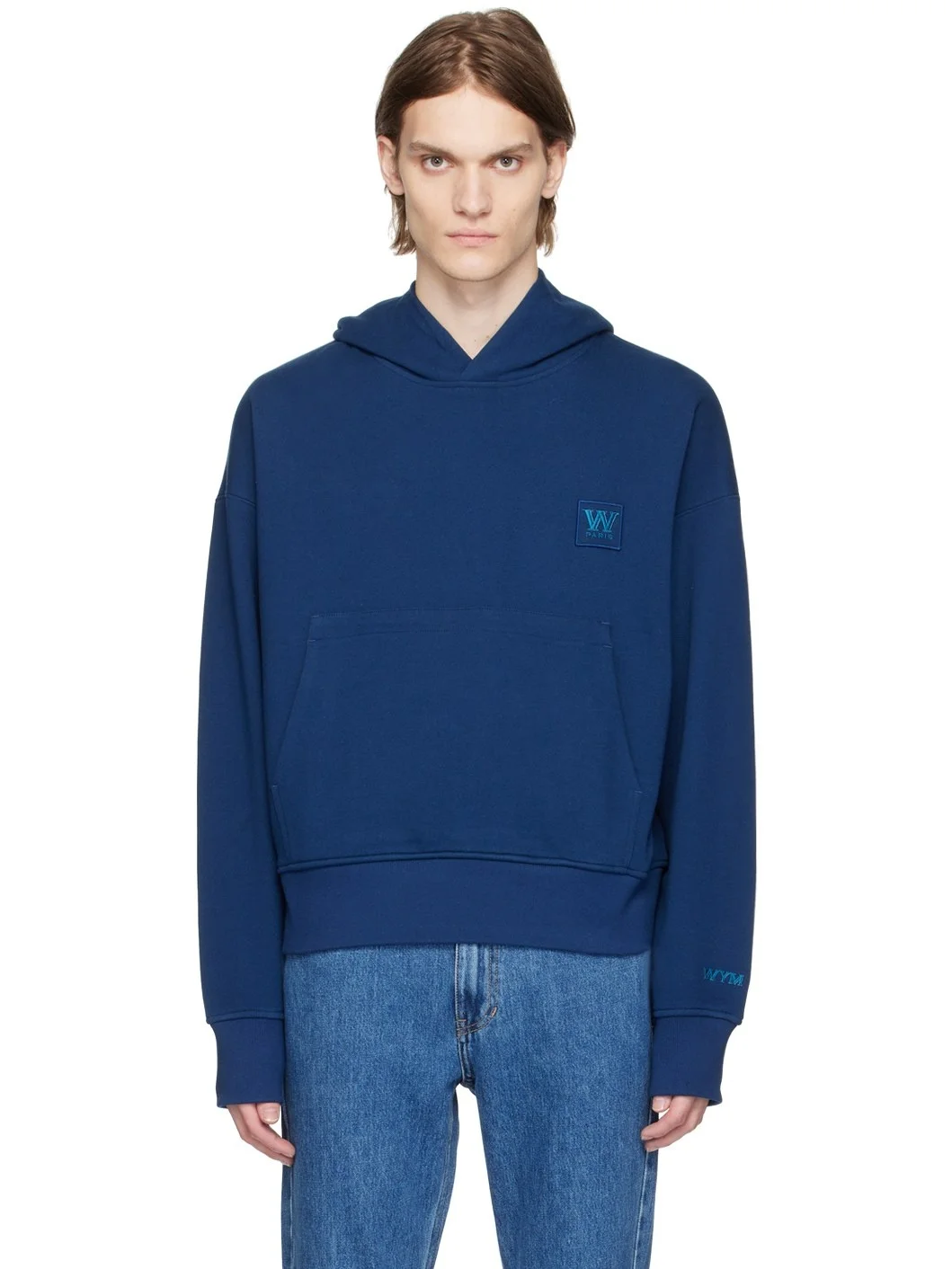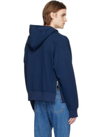 Cotton jersey hoodie. · Logo embroidered at chest and cuff · Kangaroo pocket · Rib knit hem and cuffs · Zip vent at side seam · Logo hardware at back collar · Full cotton jersey lining Supplier color: Blue