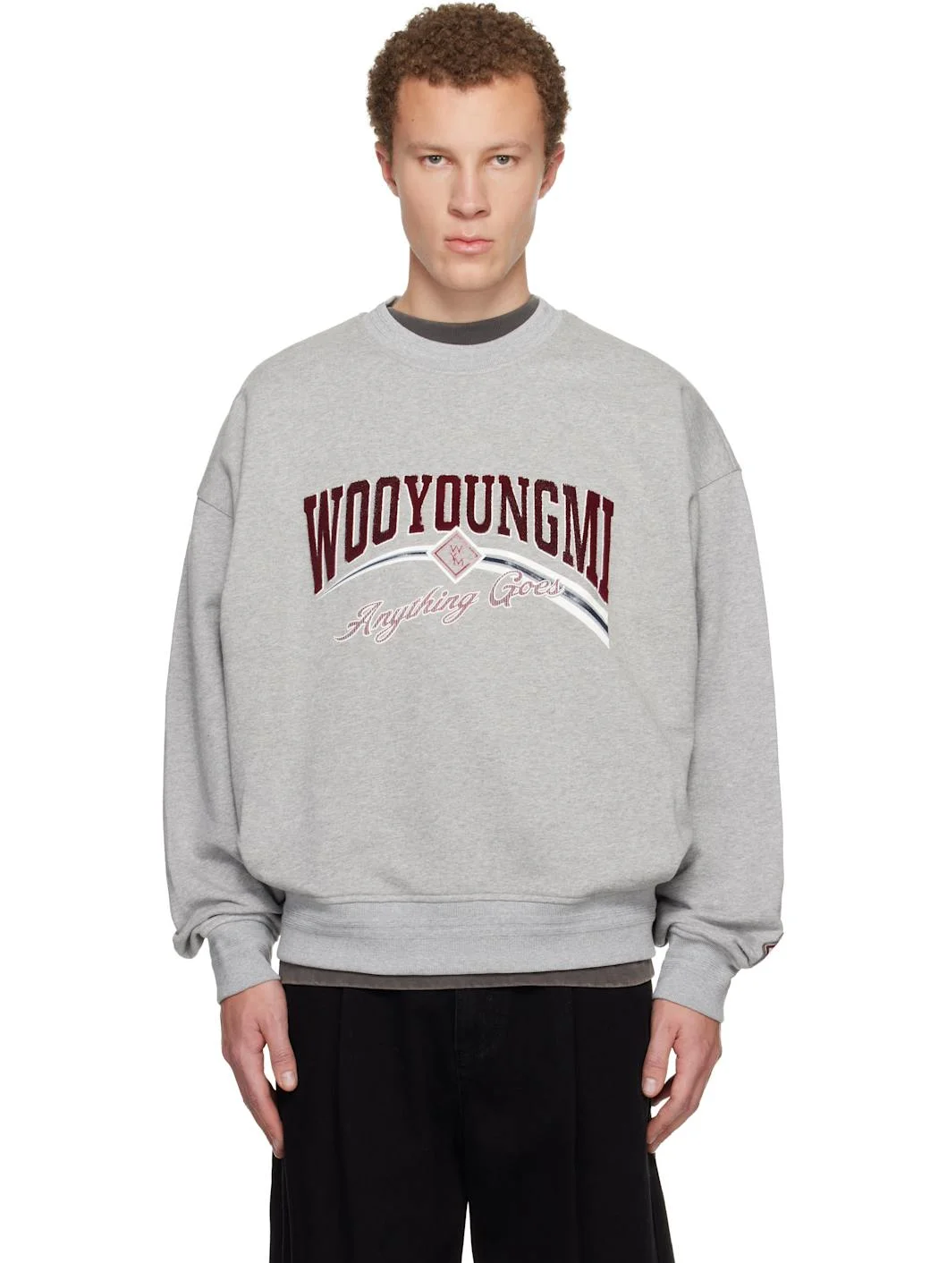 Cotton fleece sweatshirt. · Rib-knit crewneck, hem, and cuffs · Boucle logo patch at chest · Logo graphic and text printed at chest · Dropped shoulders · Logo graphic embroidered at sleeve · Logo hardware at back collar Supplier color: Grey 100% cotton. Made in South Korea 252704M204002