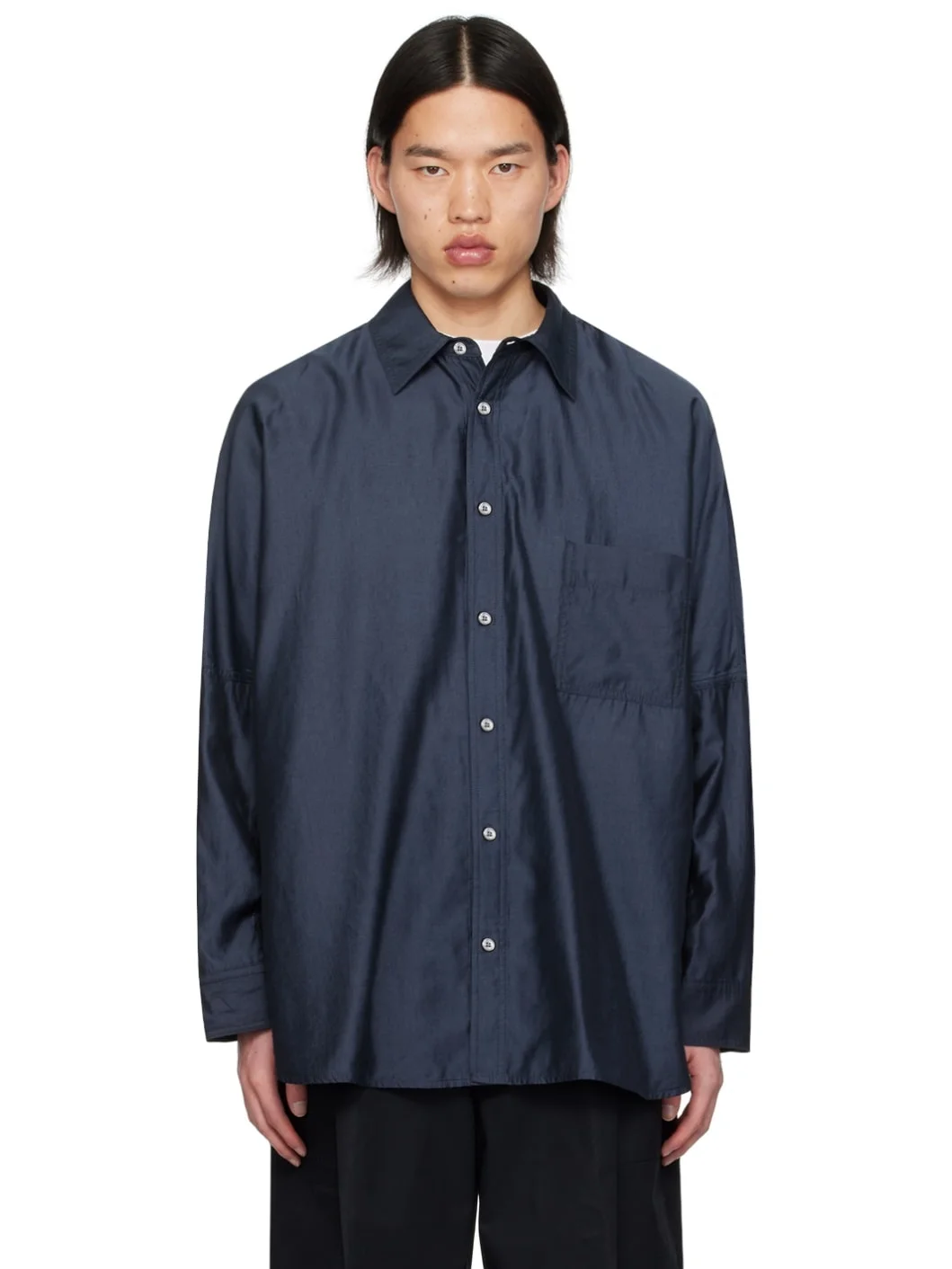 TENCEL™ lyocell- and linen-blend voile shirt. · Spread collar · Logo patch at button closure · Patch pocket · Shirttail hem · Single-button barrel cuffs · Logo hardware at back · Box pleat at back yoke · Full cotton voile lining Supplier color: Navy Body: 84% rayon, 16% polyester. Lining: 100% cotton. Made in South Korea 241704M192022