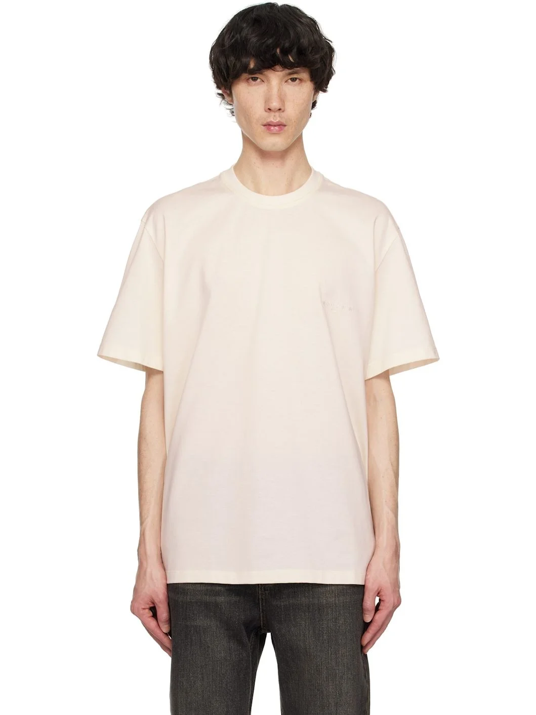Cotton jersey T-shirt. · Rib-knit crewneck · Logo embroidered at chest and back collar · Vented side seams Supplier color: Ivory Body: 100% cotton. Trim: 66% cotton, 29% polyester, 5% spandex. Made in South Korea 251704M213029