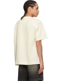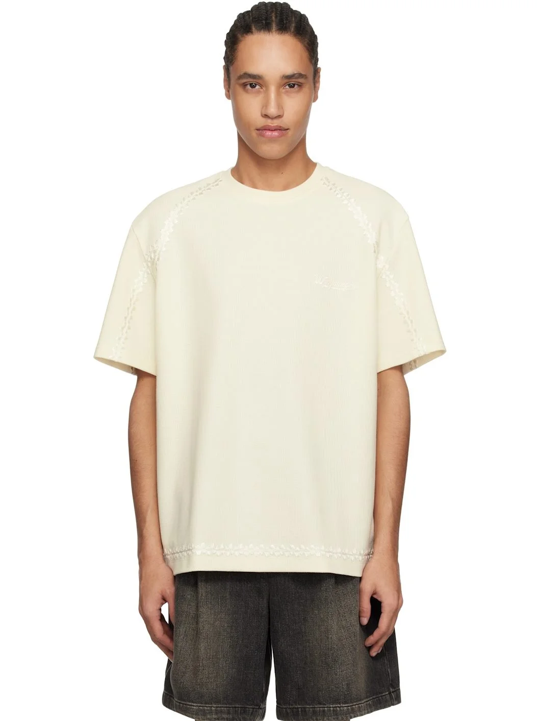 Cotton pique T-shirt. Embroidered detailing throughout. · Rib-knit crewneck · Logo embroidered at chest · Logo flag at side seam · Dropped shoulders · Logo hardware at back collar Supplier color: Ivory 59% cotton, 41% polyester. Made in South Korea 251704M213016