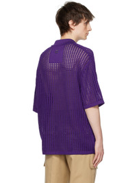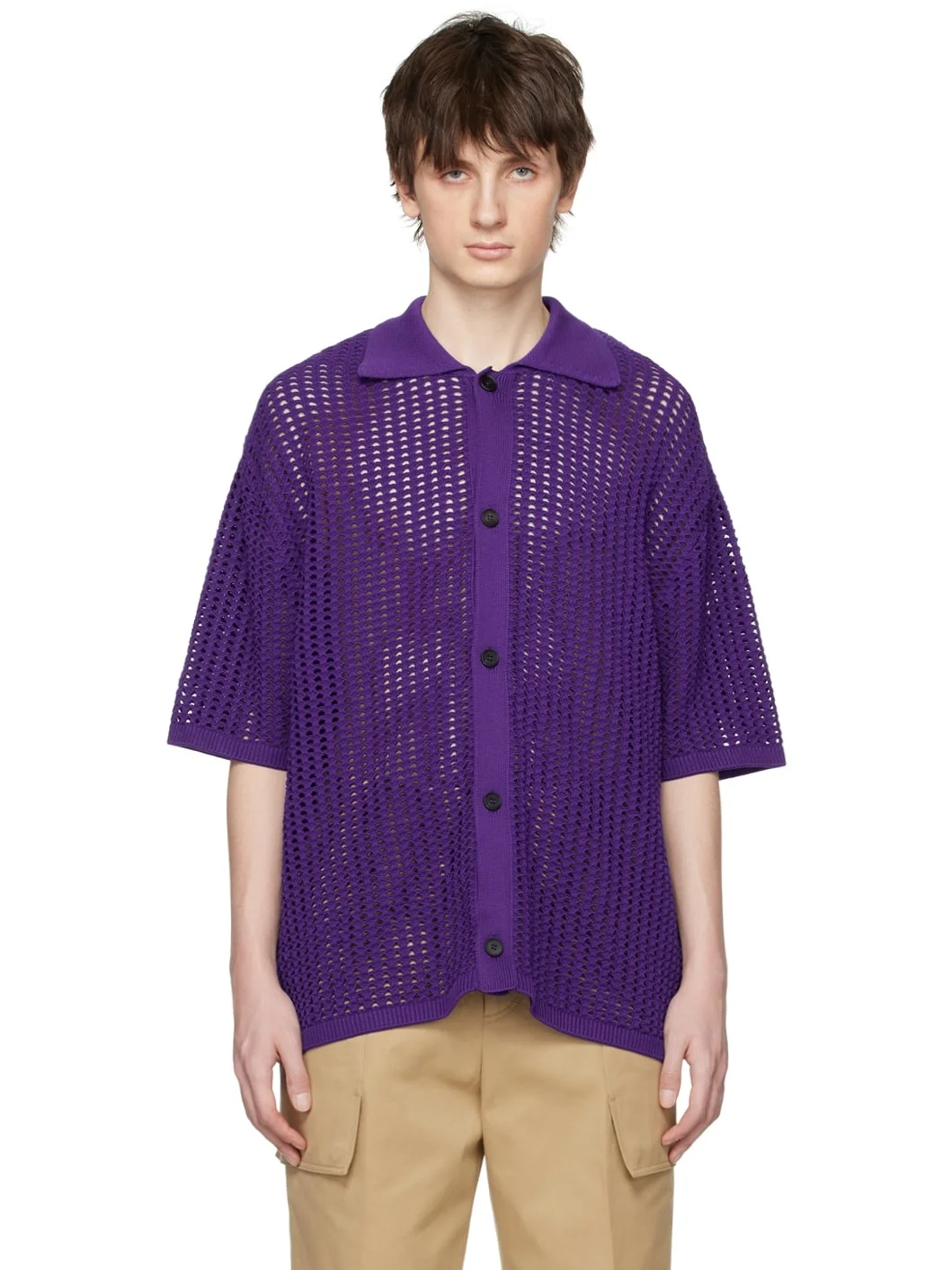 Open knit polypropylene shirt. · Rib knit spread collar, hem, and cuffs · Button closure · Logo hardware at back collar Supplier color: Violet 100% polypropylene. Made in South Korea 231704M192040
