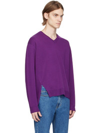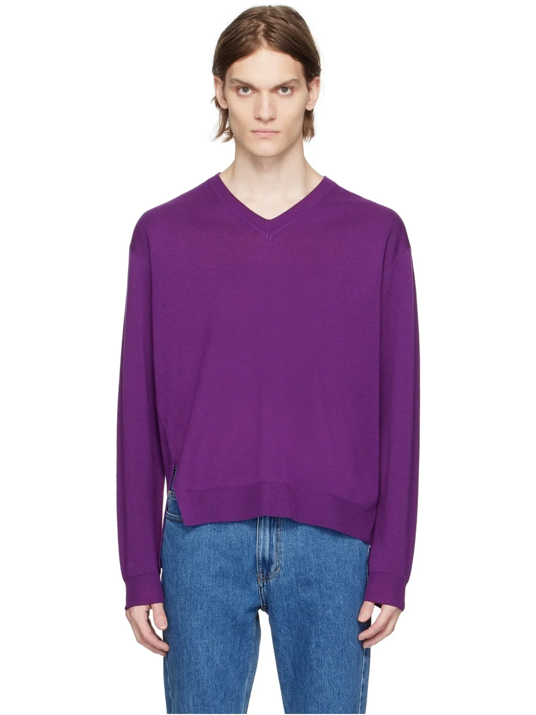 Knit wool sweater. · Rib knit V-neck, hem, and cuffs · Vented side seams · Dropped shoulders · Logo hardware at back collar Supplier color: Violet 100% wool. Made in South Korea 231704M206004