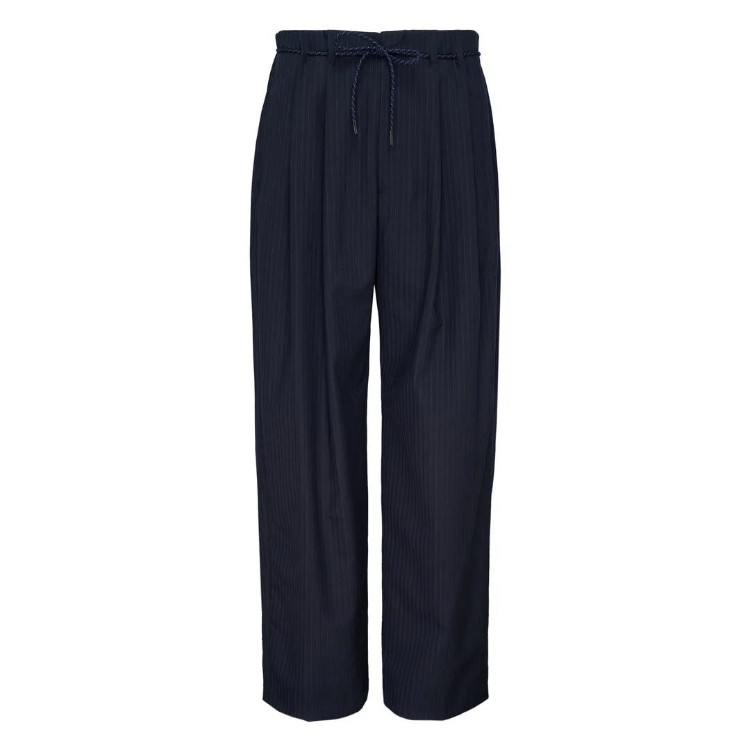 600079049NVY046 / W261PT04/00/924N - Robe-style belt detail at waist - Wide-leg silhouette - High-waisted construction - Premium suiting fabric - Cropped ankle length - Relaxed fit through legs Wooyoungmi Suiting Pants With Robe Belt Detail deliver contemporary tailoring with innovative styling elements. Crafted from premium suiting fabric in deep navy blue, featuring a unique robe-style belt detail that adds architectural interest to the silhouette. The wide-leg construction and high-waisted design create a sophisticated statement piece for modern formal wardrobes.