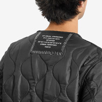 Perfect for lightweight layering, this WTAPS Liner Jacket is made from a nylon ripstop fabric with a vintage feel and sheen. Defined by a collarless silhouette, at the back collar, a patch with a printed motif is hand-stitched. - 100% Nylon - Snap Button Closure - Patch Pockets - Style Code: 251WVDT-JKM01-BLK