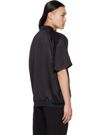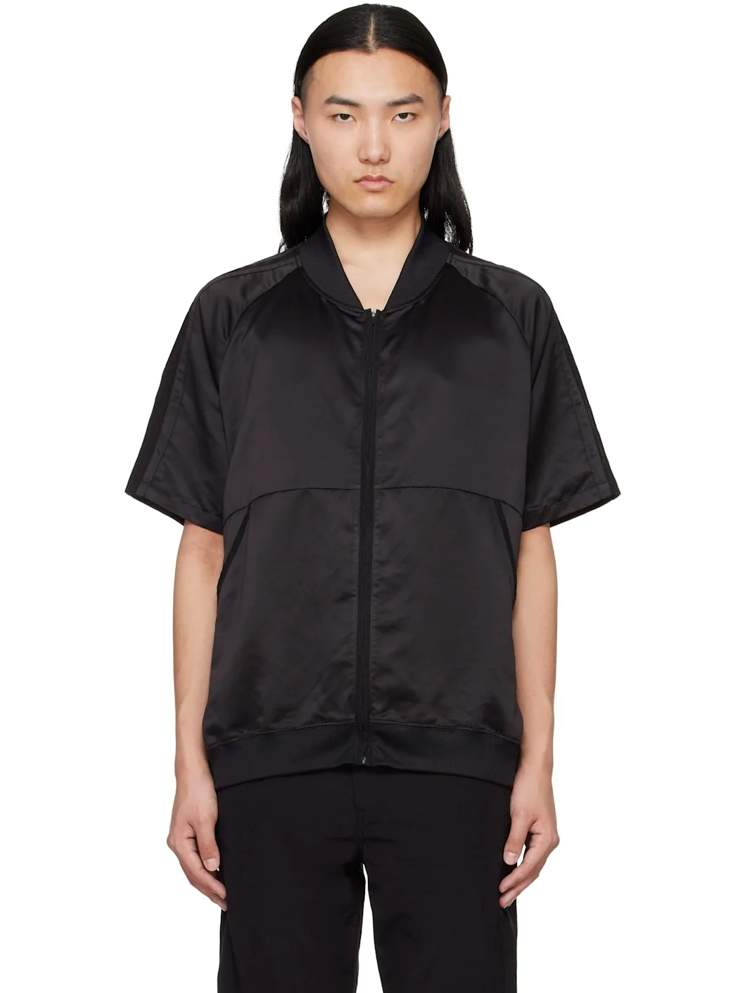 Polyester satin shirt. Plain-woven trim throughout. · Rib-knit crewneck and hem · Zip closure · Welt pockets · Raglan sleeves · Overlocking stitching at back · Full jersey lining Supplier color: Black Body 1: 100% polyester. Body 2: 55% linen, 45% rayon. Lining: 39% polyester, 21% linen, 17% rayon, 13% nylon, 10% cotton. Made in South Korea 251260M192038