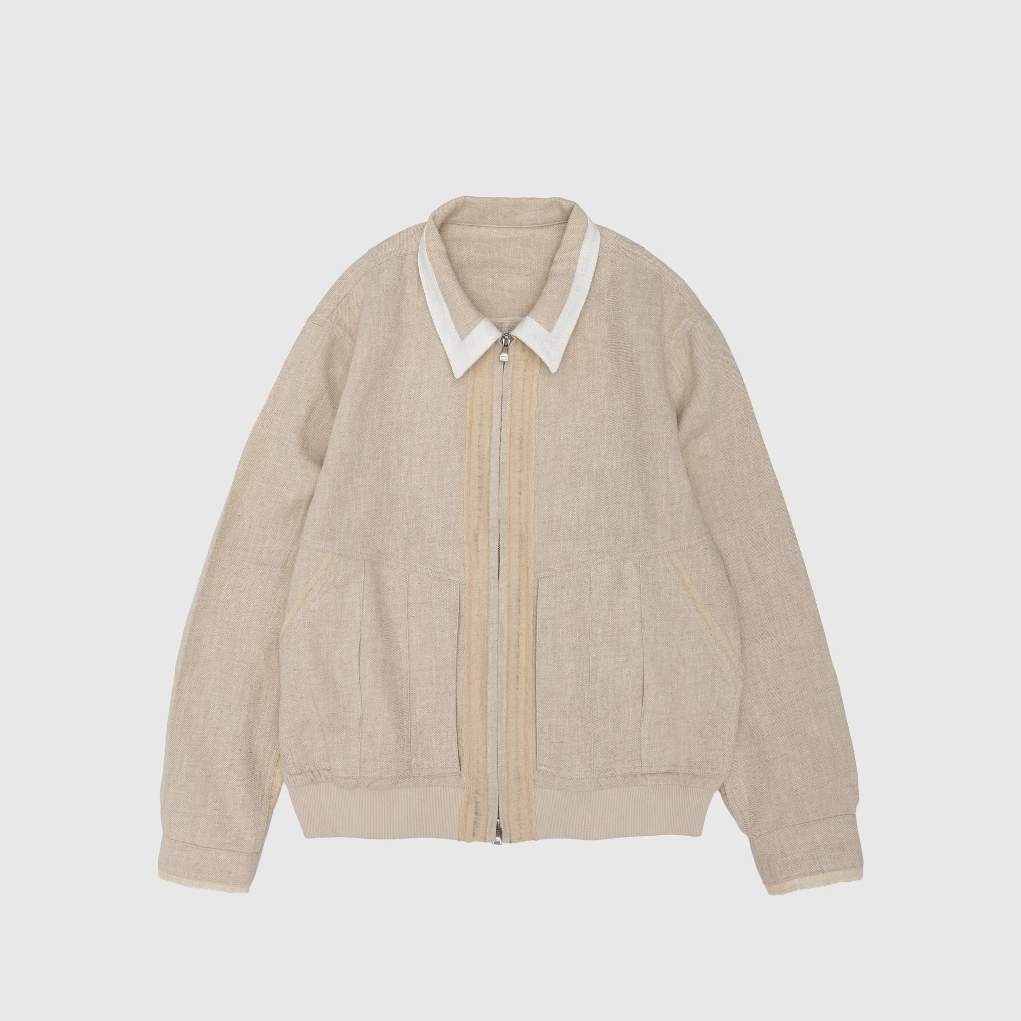 - EP7JK03-IV - Ivory - 100% Linen - Polyester twill - Paneled construction - Front two-way zipper closure - Two front welted pockets - Raw edge detailing - Adjustable snap button cuffs - Ribbed hem