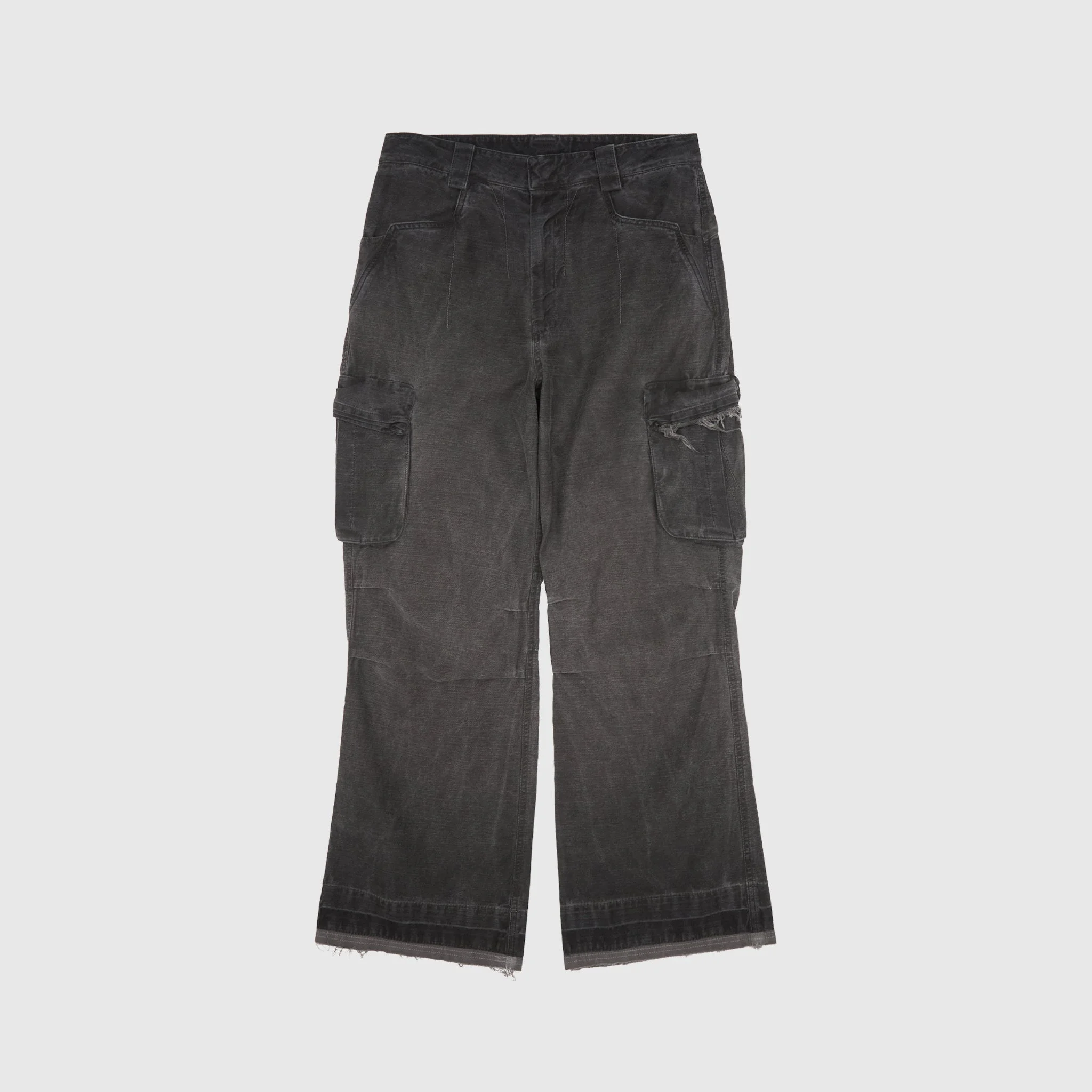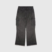 - EP08TR03-1BK - Black - 100% Cotton - Garment luna dying - Front zipper and button closure - Two front pockets - Two back pockets - Two cargo pockets with a flap and button closure - Raw hem detail - Distressed detailing - Loose fit