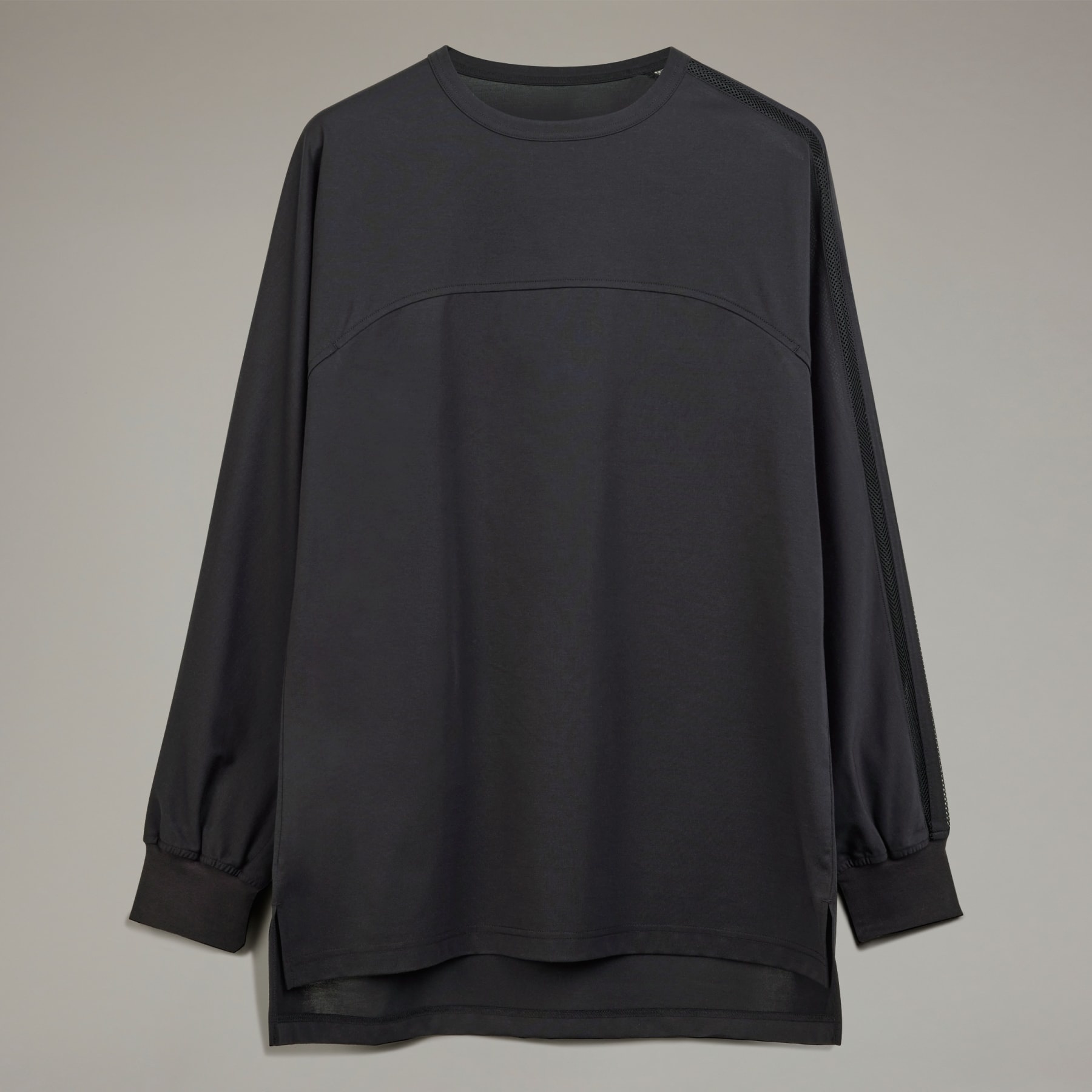 A Y-3 long sleeve tee with mesh 3-Stripes. Playing with the idea of airflow, the Y-3 Mesh Stripes Long Sleeve Tee incorporates mesh details into the soft, easy-wearing design. It's made of cotton-blend fabric with a loose-fitting silhouette and a Y-3 logo sign off. Details - Loose fit - Round neck - 55% cotton, 45% polyester (recycled) - Y-3 logo - Imported - Product code: JL8309 - Product color: Black