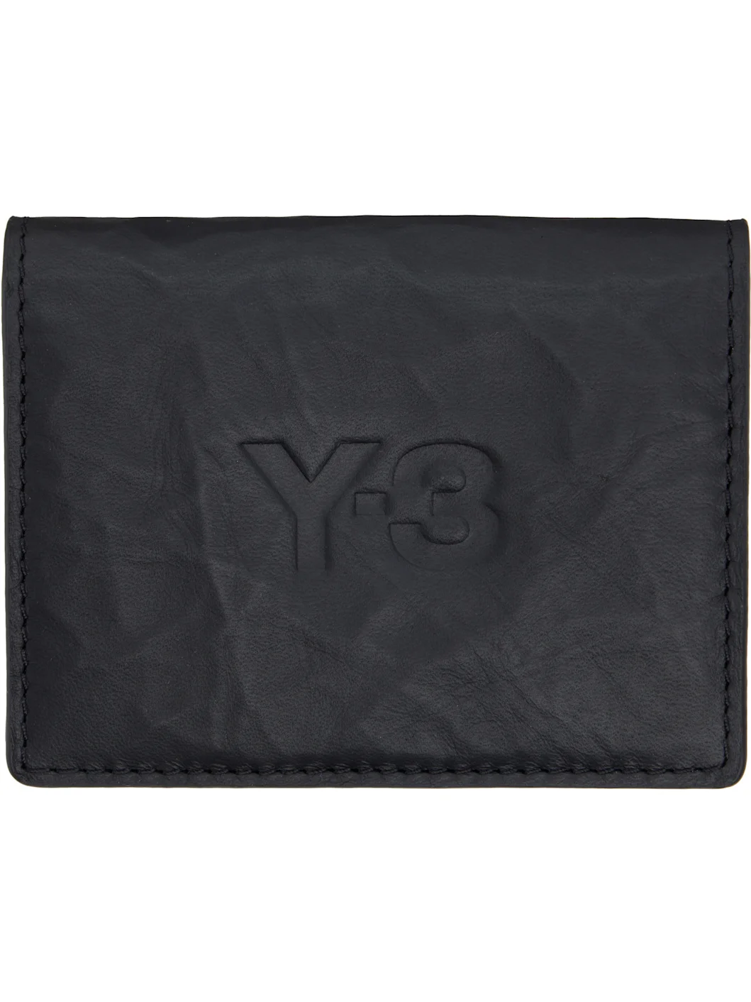 Creased leather bifold card holder. · Logo embossed at face · Three card slots at back face · Press-stud closure · Coin compartment at interior · H3" x W4" x D0.75" Supplier color: Black Leather. Made in Viet Nam 261138M163000