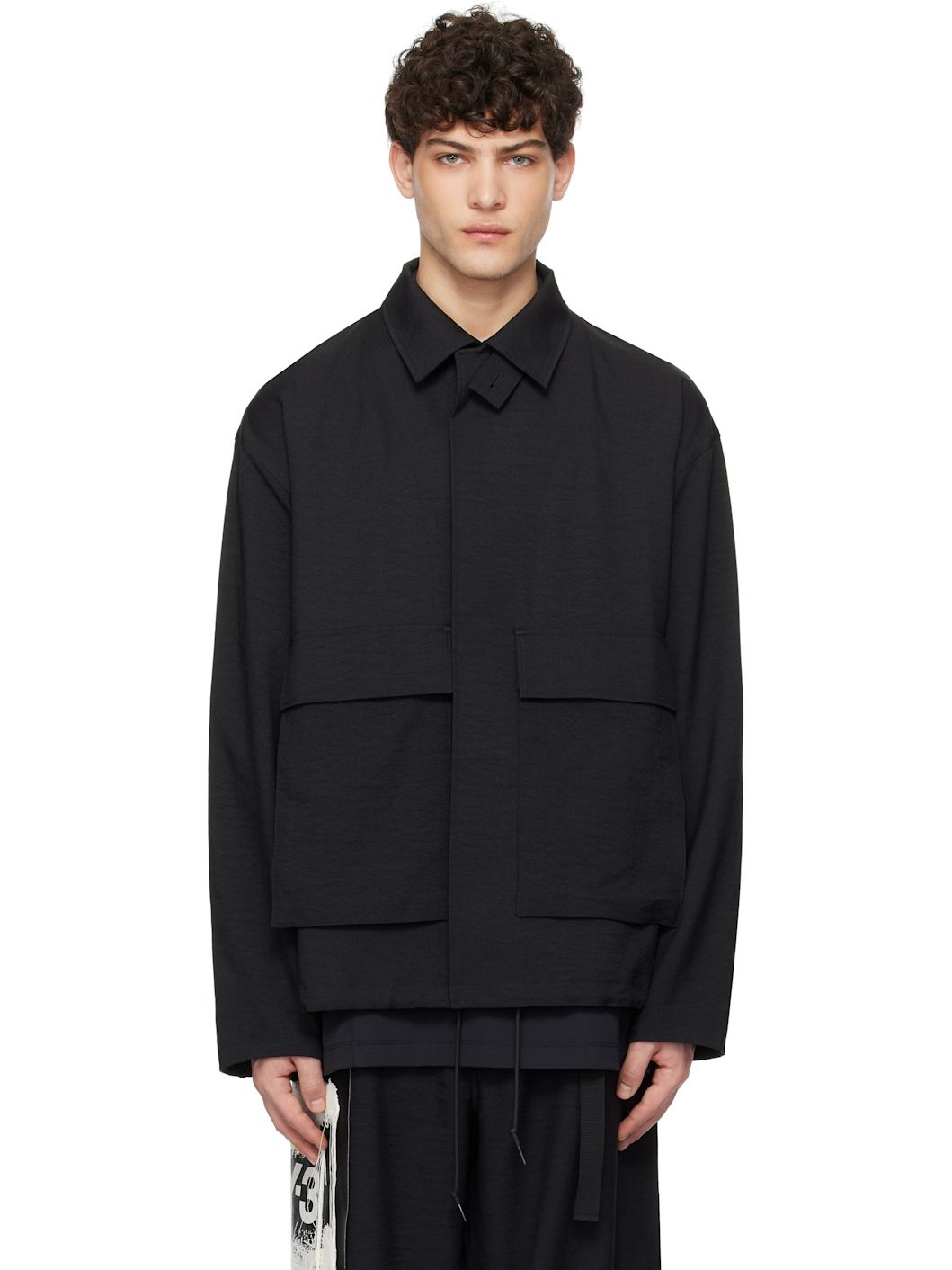 Recycled polyester twill jacket. · Spread collar · Concealed button closure · Flap and seam pockets · Dropped shoulders · Adjustable button fastening at cuffs · Logo patch with loose threads at back · Patch pocket at interior · Horn hardware Supplier color: Black