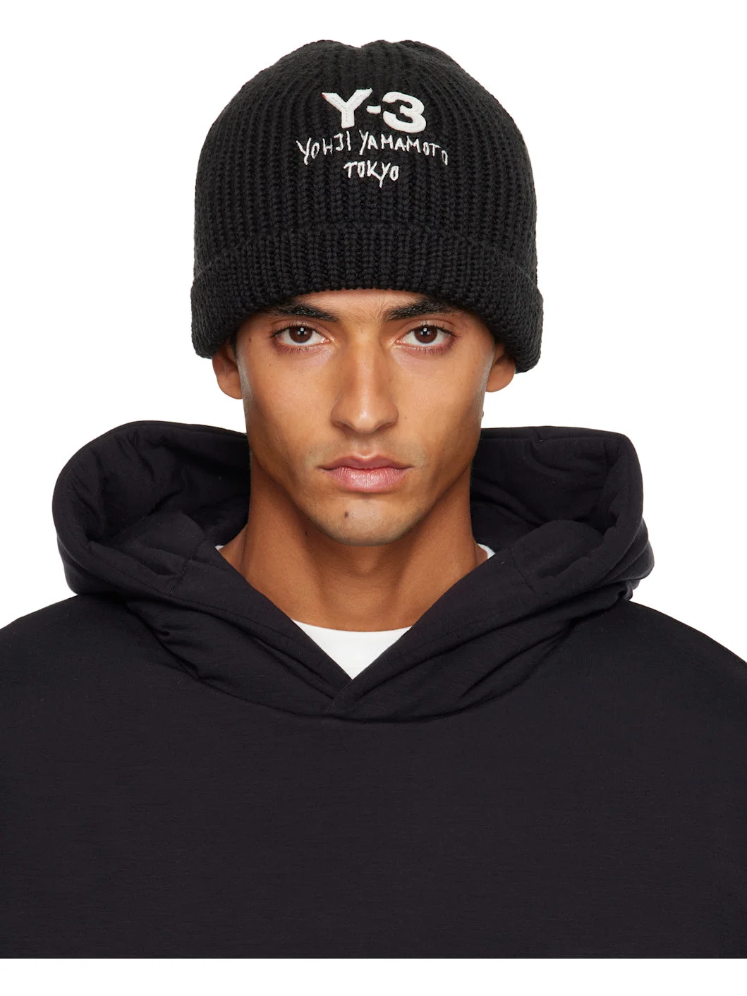 Rib-knit merino wool beanie. · Logo and text embroidered at face · Rolled brim Supplier color: Black 100% merino wool. Made in Taiwan, China 252138M138001