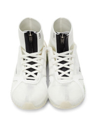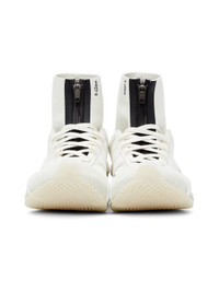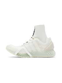 Low-top mesh sneakers in white. Tonal textured rubber trim throughout. Round toe. Lace-up closure. Detachable Primeknit® sock-style insert featuring signature stripes bonded in black and bonded rubber trim in black with text printed in white at vamp. Logo bonded in black and white at outer side. Partially concealed signature stripes at sides. Tonal padded suede trim in off-white at heel counter. Partially concealed 4D® midsole in green. Treaded rubber outsole in off-white. Alternate detachable high-top Primeknit® sock-style insert featuring signature stripes bonded in black, text and logo bonded in black and white, and zip closure in black included. Supplier color: Black/White Upper: textile. Sole: rubber.