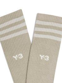 Y-3 Stripes High Socks in Light Brown from Y-3 Highlights - light brown - knee-high, high-calf design - engineered 3-Stripes at cuff - embroidered Y-3 logo at centre front - clean, athletic silhouette - comfortable for everyday wear The Y-3 Stripes High Socks combine adidas’ sportswear heritage with Y-3’s distinctive avant-garde style. Designed to sit high on the calf, they create a sleek, athletic profile with refined detailing. The engineered 3-Stripes at the cuff and the embroidered Y-3 logo at the front provide a subtle yet sophisticated touch. Ideal for streetwear styling or casual comfort, these socks deliver a perfect blend of fashion and function. Made in Turkey Designer ID: KT3226 Colour ID: Light Brown Materials 57% COTTON BCI / 39% RECYCLED POLYESTER / 3% ELASTANE / 1% OTHER