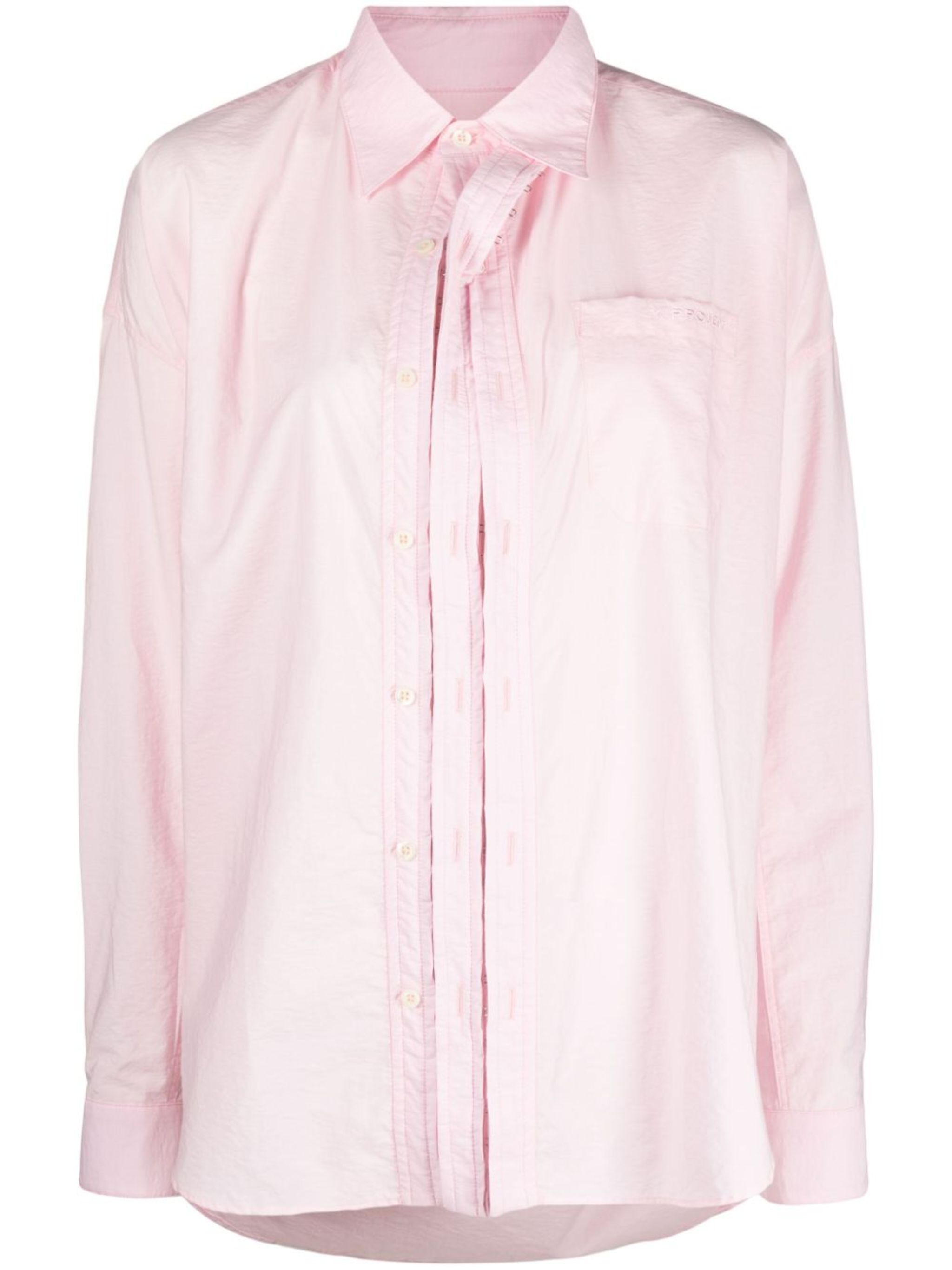 asymmetric cotton-blend shirt from Y / PROJECT featuring light pink, cotton blend, asymmetric design, panelled design, embroidered logo at the chest, seam detailing, spread collar, drop shoulder, front button fastening, front hook and eye fastening, long sleeves, buttoned cuffs, chest patch pocket and rear curved hem. Size & Fit Model Measurements: Height: 1.76 m Bust/Chest: 82.0 cm Hips: 88.0 cm Waist: 60.0 cm Model wears size XS Fabric and Care Designer Style ID: SHIRT70 Designer Colour: LIGHT PINK Composition: Polyamide 17%, Cotton 83% Washing instructions: Machine Wash Made in Portugal