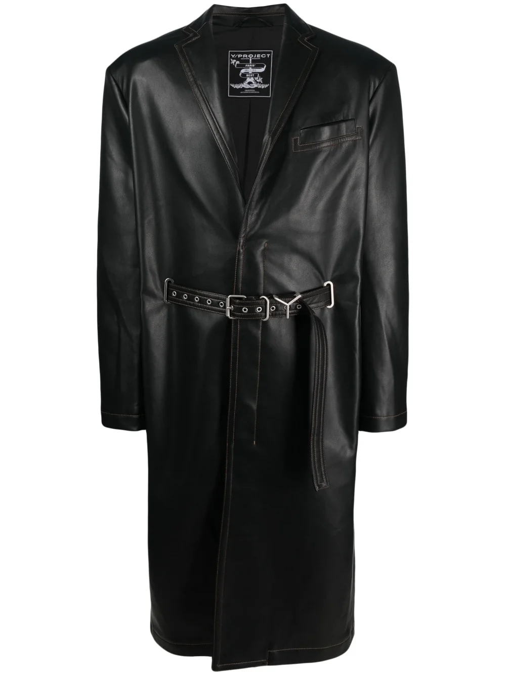 belted faux-leather coat Y/Project offers a structured design with this single-breasted coat. Crafted from faux leather, it features an integrated signature Y belt for a personalisable silhouette. Highlights - Black - Faux leather - Contrast stitching - Logo-engraved buttons - Notched lapels - V-neck - Long sleeves - Belted waist - Chest welt pocket - Two diagonal pockets to the sides - Central rear vent Imported Composition Outer: Polyurethane 100% Lining: Polyester 100% SIZE & FIT Model measurements Height 6 ft 2 in(1.87 m) Bust/Chest 36.41 in(92.5 cm) Hips 37 in(94 cm) Waist 29.52 in(75 cm) FittingInformation Designed to be unstructured, offering a loose fit throughout The belt offers adjustability for fitted preferences Made from a midweight non-stretch fabric This piece fits true to size – take your usual size Washing instructions Machine Wash