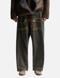 - Y/PROJECT - Evergreen Paris' Best Patch Jeans - Fully sustainable Evergreen collection - Made of organic cotton - High waisted - Wide leg - Distressed Y/PROJECT Paris' Best patch stitching - 5-pocket style - Color: Evergreen Vintage Black - Country Of Origin: FR - Material: 100% Organic Cotton - See more Jeans and Clothing SIZING - Model wears size 32 - Model measures: Height 189 cm, Chest 31.5"/80cm, Waist 27”/69cm, Hip 34.3’’/87cm