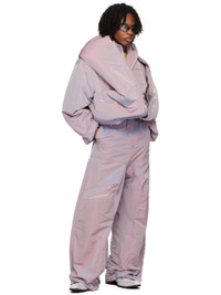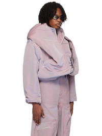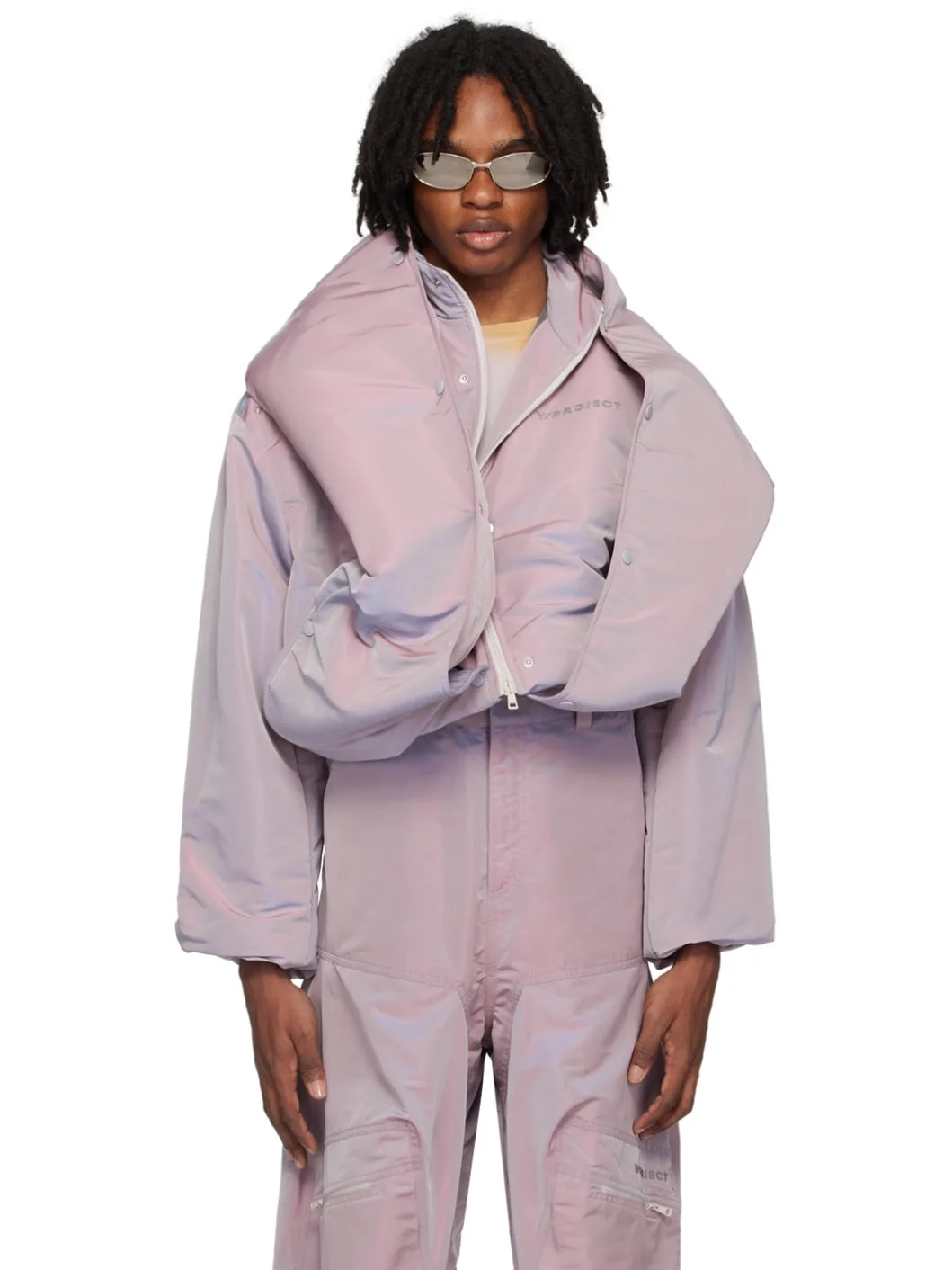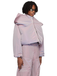Padded polyester taffeta puffer jacket. Integrated extended hood-style overlay for alternate styling. · Layered construction · Stand collar · Two-way zip closure · Logo bonded at front · Welt pockets · Concealed bungee-style drawstring at cropped hem · Welt pocket at interior · Full taffeta lining Supplier color: Iridescent lilac 100% polyester. Made in Poland 241893M178000