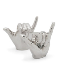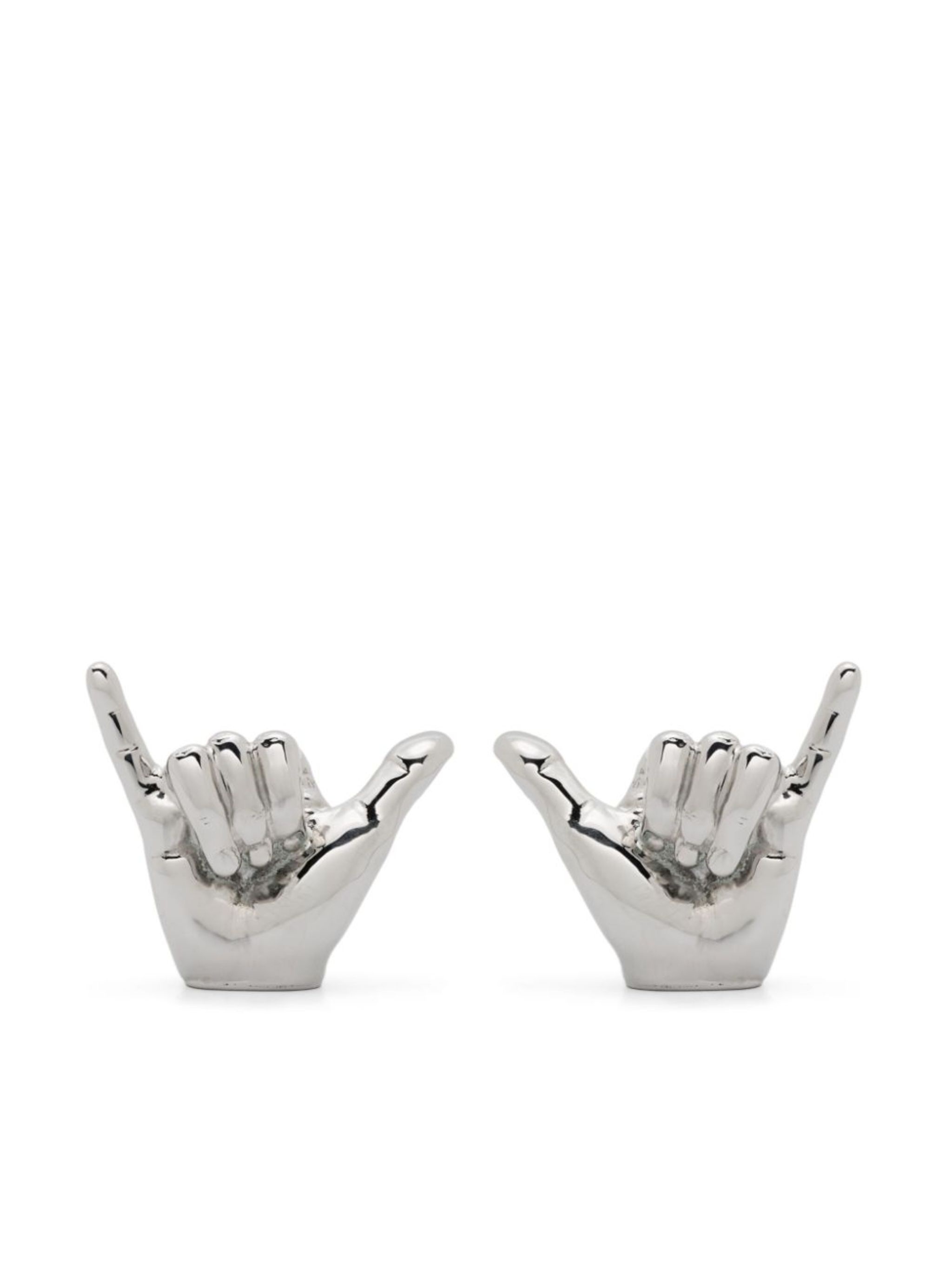 silver-tone polished finish hand shape sculpted design stud design butterfly fastening for pierced ears These earrings come as a pair. Size & Fit Model Measurements: Height: 1.88 m Bust/Chest: 94.0 cm Hips: 92.0 cm Waist: 74.0 cm Model wears size OS Fabric and Care Designer Style ID: 640EA022 Designer Colour: SHINY SILVER Composition: Brass 100%Made in Italy