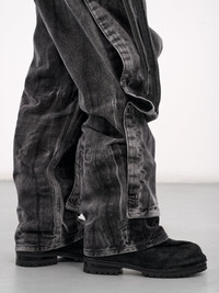Y/PROJECT jeans in black, paneled denim construction, fading & whiskering, velcro paneling throughout, belt loops, back logo patch, back patch pockets, paneled draping, wide leg, relaxed fit. Made in Portugal 100% Cotton Standard Sizing Model is 6'1” and wears a size 32. Shoulders: 17” Chest: 33” Waist: 30”