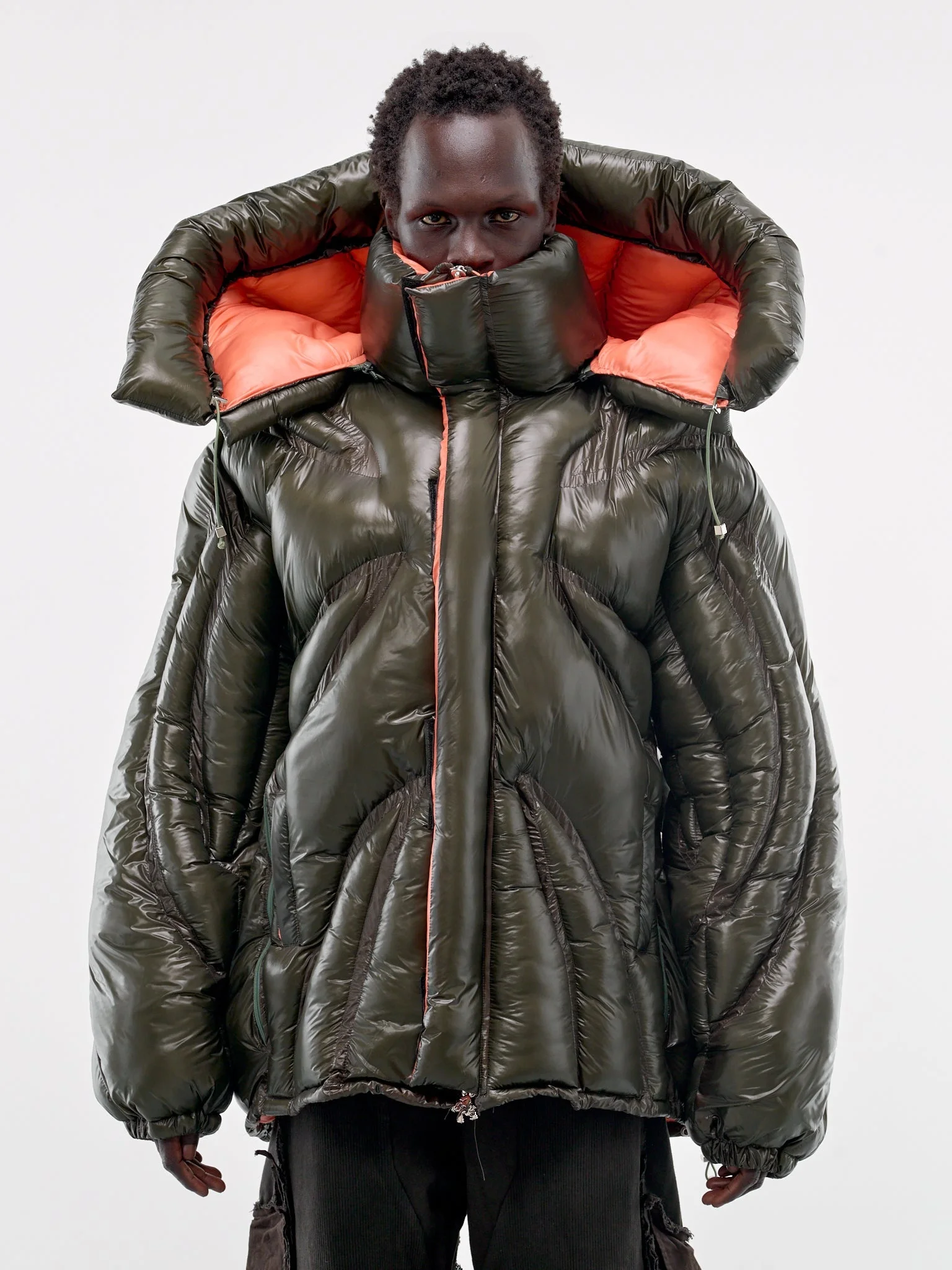 YAKU jacket in violet, four-arm puffer jacket design, paneled nylon construction, glossy finish, padded, quilted, exaggerated high neck, oversized hood, adjustable drawcord, front concealed zip placket closure, long sleeves, elasticated cuffs, side pockets, hem adjustable drawcord, straight hem, oversized fit. Made in UK Outer: 100% Nylon Fill: 100% Polyester Standard Sizing Model is 5'11.5" wearing size L. Shoulders: 16" Chest: 32.5" Waist: 30"
