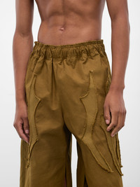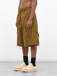 Beige linen shorts with graphic overlays and raw hems throughout. Designed with an elasticated waistband, side vents, and self-tie fastenings for adjustable styling. Featuring: • Baggy fit and wide leg • Linen construction • Graphic overlays • Raw hems throughout • Elasticated waistband • Side pockets • Side vents and flap • Self-tie fastening at sides • Knee-length • Made in UK • Main: 100% Linen | Applique: 100% Cotton • Standard sizing Model is 6'1" wearing size M. Shoulders: 19" Chest: 33.5" Waist: 27.5"