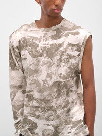 A white and khaki T-shirt in a faded camouflage pattern with distressing throughout. Designed with a shoulder pad and asymmetrical construction featuring one long sleeve and one sleeveless arm. Featuring: • Relaxed fit • Cotton construction • Faded camouflage pattern • Distressing and wear throughout • Crewneck • Shoulder pad • Asymmetrical design: one long sleeve, one sleeveless • Made in UK • 100% Cotton • Standard sizing Model is 6'1" wearing size M. Shoulders: 19" Chest: 33.5" Waist: 27.5"