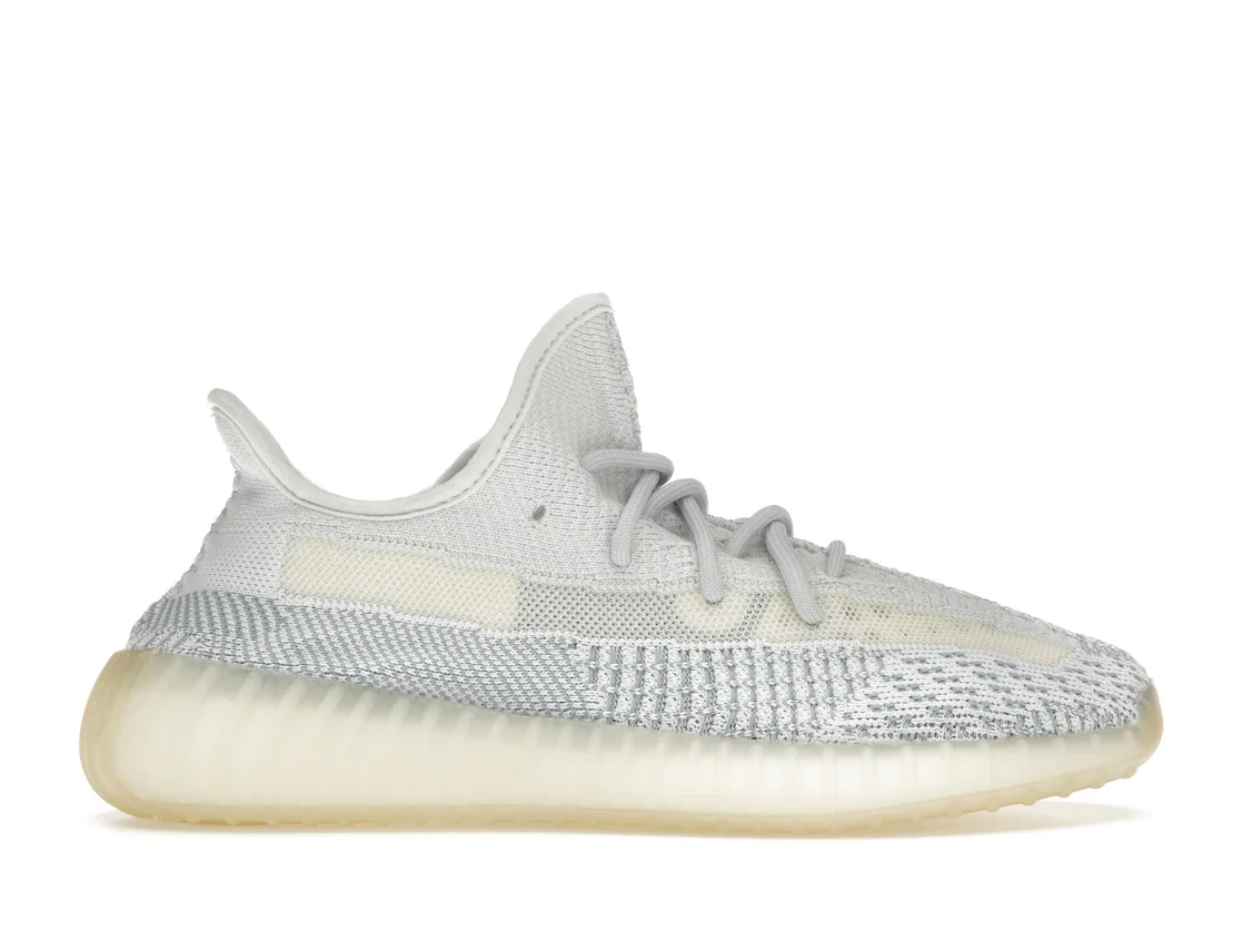 The adidas Yeezy Boost 350 V2 Cloud White (Non-Reflective) combines shades of cream and bluish-white to recreate the hue of a fluffy cloud. A hard sole offers a contrast to the elastic shoelaces and knitted fabric upper. Instead of separate overlays, the upper has the appearance of a single stitched-together piece. One side of the sneaker offers a transparent strip, and the other highlights the blue-and-white patterns. The adidas Yeezy Boost 350 V2 Cloud White (Non-Reflective) uses Primeknit to create a woven textile appearance. adidas Yeezy Boost 350 V2 Cloud White (Non-Reflective) released in September of 2019 and retailed for $220. - Style FW3043 - Colorway Cloud White/Cloud White/Cloud White - Retail Price 220 - Release Date 2019-09-21 - Featured false
