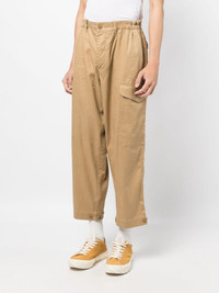 elasticated-waist cropped trousers Highlights - Beige - Cotton-linen blend - Belt loops - Elasticated waistband - Front button fastening - Two side slit pockets - Side cargo pocket - Two rear flap pockets - Straight leg - Cropped Imported Composition Linen/Flax 53%, Cotton 47% SIZE & FIT Model measurements Height 6 ft 2 in(1.87 m) Bust/Chest 31.49 in(80 cm) Hips 37.79 in(96 cm) Waist 27.95 in(71 cm) FittingInformation Designed for a relaxed tapered leg, allowing a comfortable loose fit above the knee with a closer fit towards the calves Adjust this piece’s waistband to your preference using the drawstring Made from a midweight stretch fabric, this piece offers elasticity and flexibility when worn This piece fits true to size – take your usual size