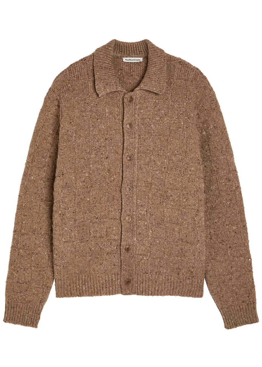 Info & Care YMC wool-blend cardigan Subtle checked pattern, ribbed trims Button fastening through front 80% merino wool, 20% polyamide Hand wash; Size & Fit Length shoulder to hem: 26 inches/ 66cm Midweight Boxy fit Model is 6'1"/ 185cm, chest size 36 inches and wears a size medium