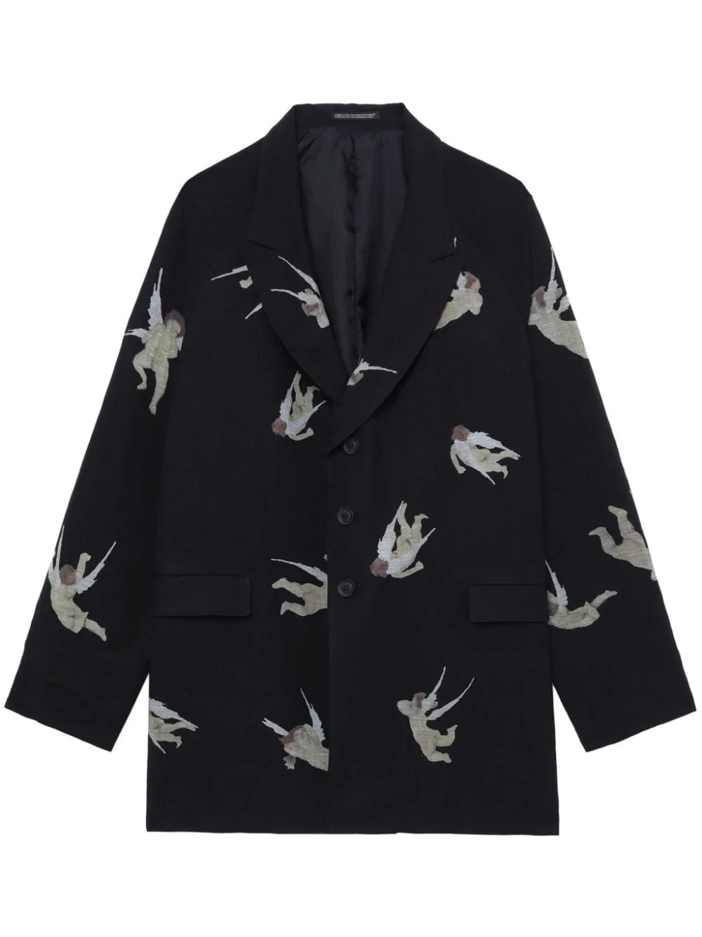 angel-print single-breasted blazer Highlights - Black/multicolour - Linen blend - All-over graphic print - Text print - Peak lapels - Front button fastening - Drop shoulder - Long sleeves - Two side flap pockets - Straight hem Imported Composition Flax 55%, Rayon 45%
