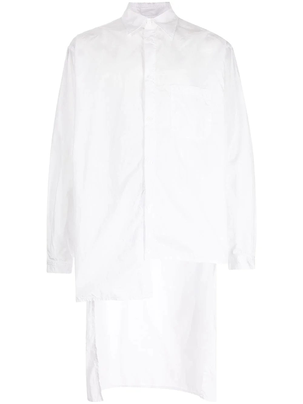 asymmetric long-sleeve shirt Unmistakably Yohji Yamamoto, this shirt showcases the Japanese brand's penchant for avant-garde tailored designs. In a white colourway, this long-sleeve piece is distinguished by its modern asymmetric hem. Imported Composition Cotton 100% SIZE & FIT Model measurements Height 6 ft 2 in(1.87 m) Bust/Chest 35.43 in(90 cm) Hips 36.41 in(92.5 cm) Waist 27.55 in(70 cm) FittingInformation This piece fits true to size. We recommend you get your regular size Cut for a loose fit Made with a mid-weight fabric Washing instructions Hand Wash