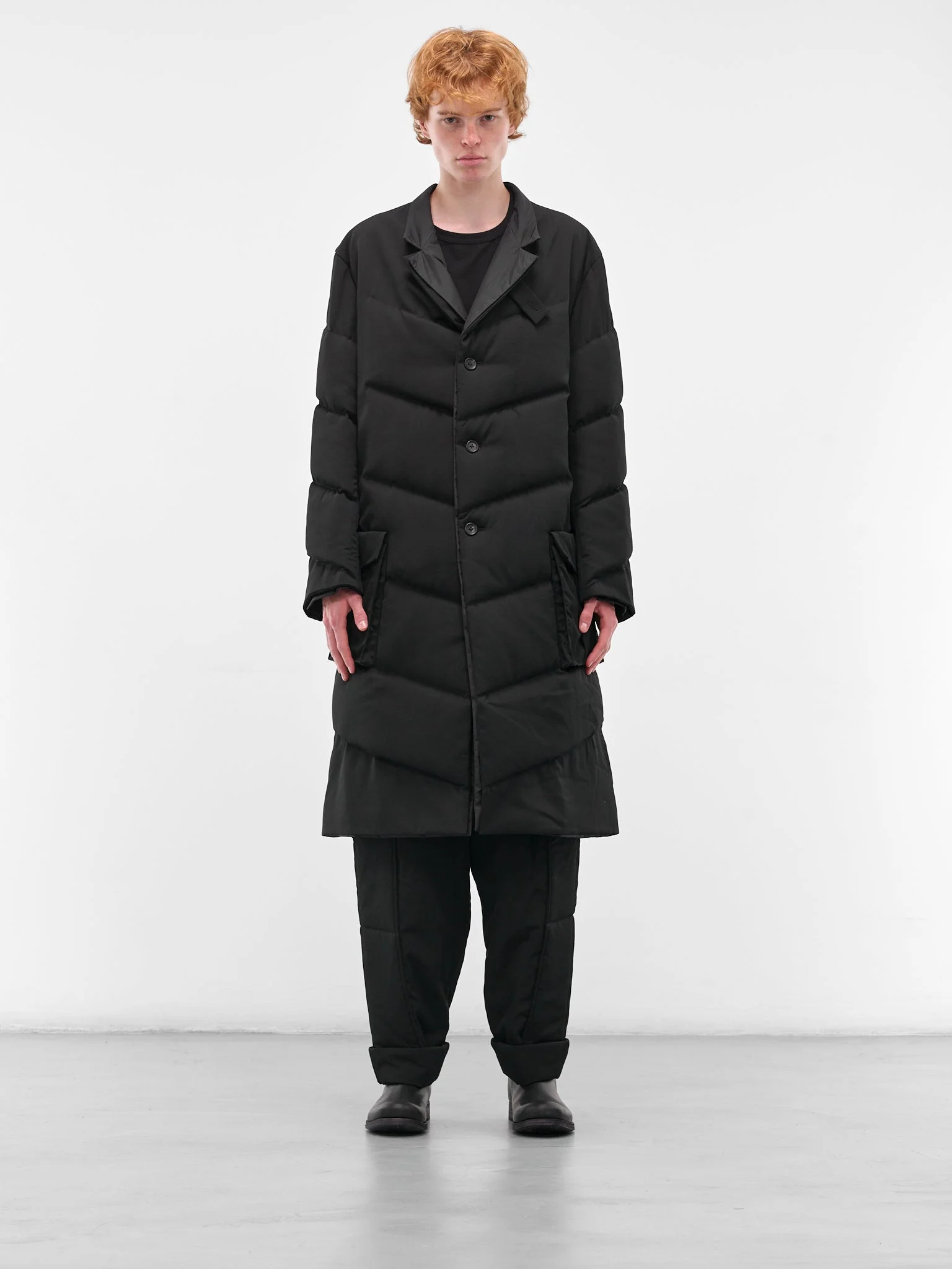 A black padded coat with a quilted construction and layered notched lapel. The mid-length silhouette balances relaxed structure with side flap pockets and a front button closure. Featuring: • Relaxed fit • Padded and quilted construction • Layered notched lapel • Front button closure • Long sleeves • Side flap pockets • Mid-length • Made in Japan • Japanese sizing Model is 6'3" wearing size 3. Shoulders: 18" Chest: 36" Waist: 28.5"