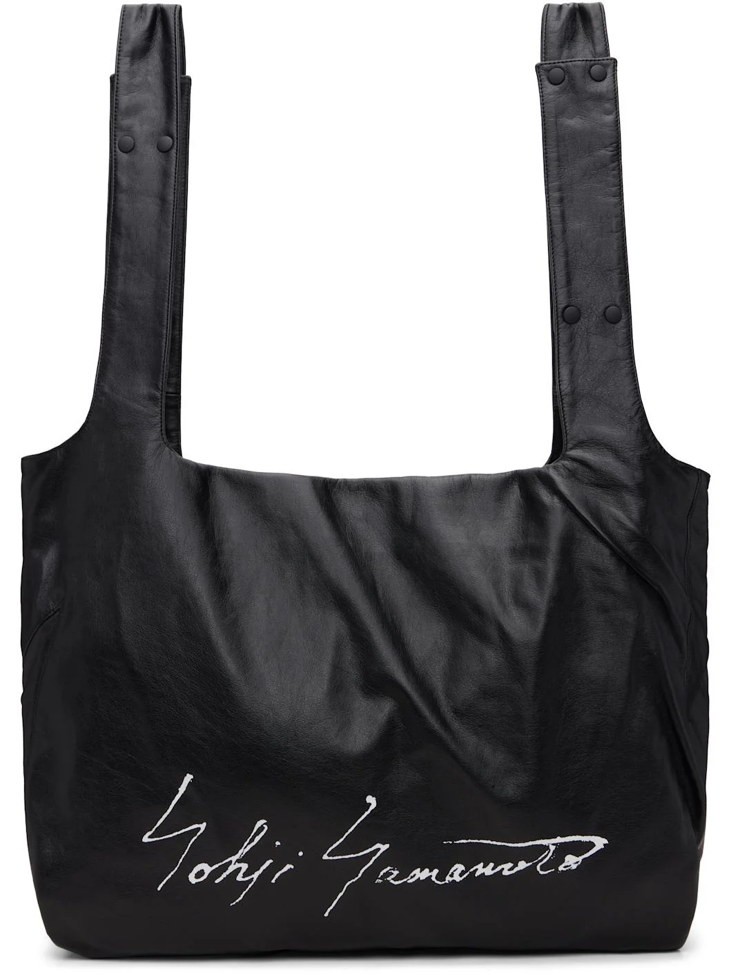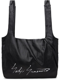 Grained leather tote. · Twin shoulder straps · Press-stud fastenings at straps for crossbody styling · Logo printed at face · Press-stud closure · Patch pocket at interior · Twill lining · H16.5" x W21.5" x D5.5" Part of the discord YOHJI YAMAMOTO collection. Supplier color: Black Leather. Made in Japan 252573M172002