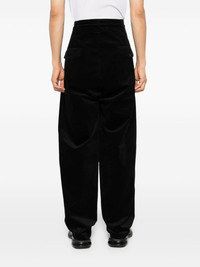 corduroy trousers Highlights - Black - Concealed fly and button fastening - Two side slit pockets - Two rear flap pockets - High-waisted Imported Composition Lining: Cupro 100% Outer: Cotton 98%, Polyurethane 2% SIZE & FIT Model measurements Height 6 ft 1 in(1.85 m) Bust/Chest 35.43 in(90 cm) Hips 36.22 in(92 cm) Waist 28.74 in(73 cm) FittingInformation Designed for a relaxed tapered leg, allowing a comfortable loose fit above the knee with a closer fit towards the calves Adjust this piece’s waistband to your preference using the drawstring Made from a midweight non-stretch fabric