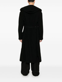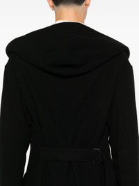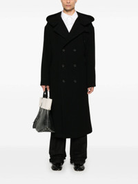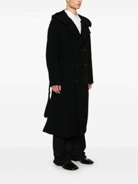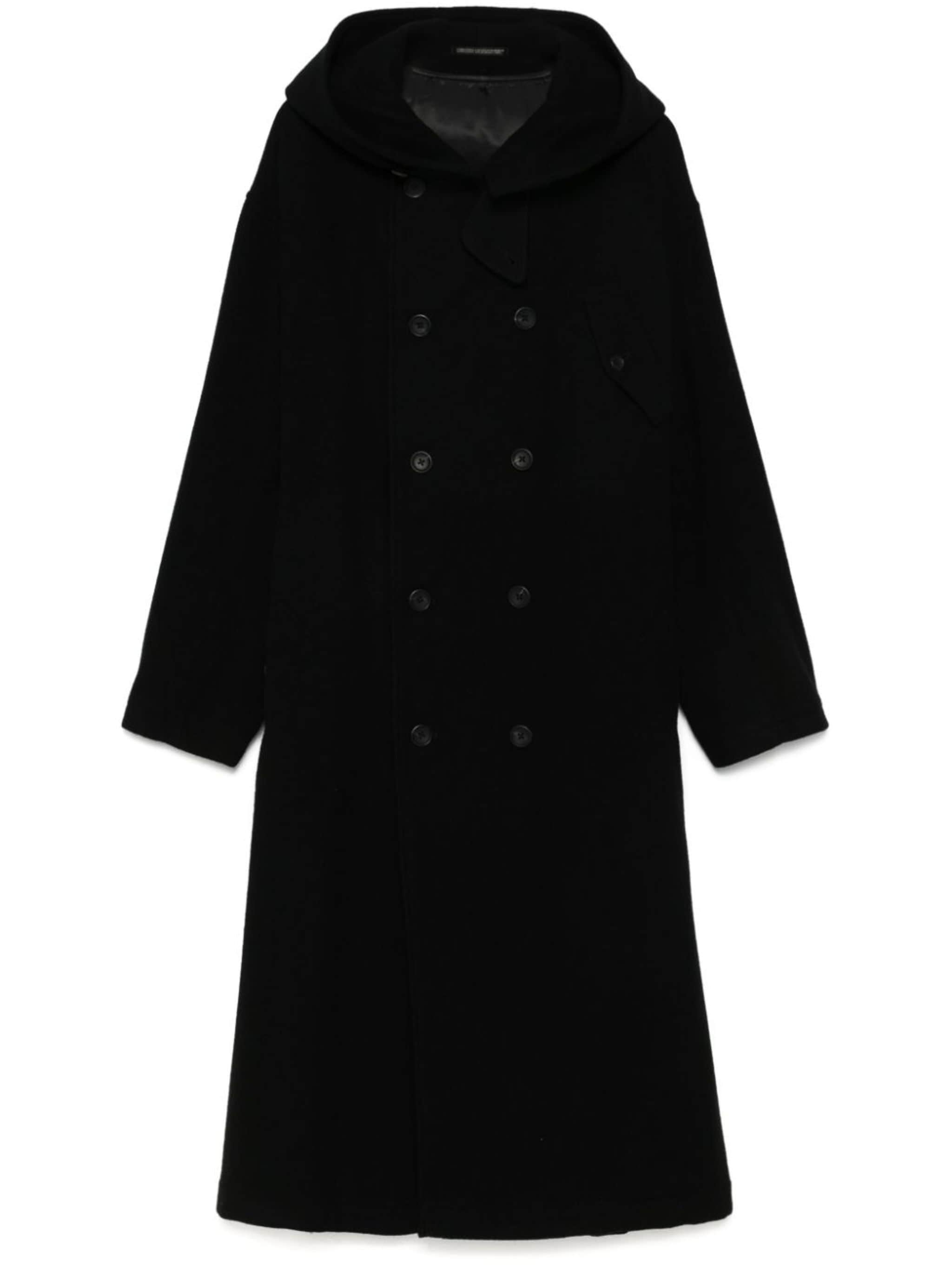 black wool blend non-brushed fleece double-breasted button fastening classic hood drop shoulder long sleeves chest flap pocket belted waist two side button-fastening pockets full lining straight hem mid-length Size & Fit Model Measurements: Height: 1.85 m Bust/Chest: 93.0 cm Hips: 96.0 cm Waist: 73.0 cm Model wears size 3 Fabric and Care Designer Style ID: HOC07102 Designer Colour: 1 BLACK Composition: Outer: Nylon 10%, Wool 90%; Lining: Cupro 100% Washing instructions: Dry Clean Only Made in Japan