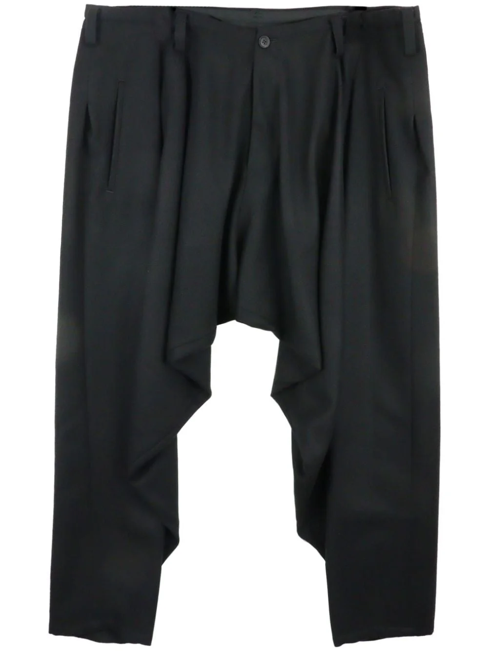 drop-crotch wool trousers Yohji Yamamoto applies its eye for innovative tailoring to design these black wool trousers. They fuse smart front pleats with a drop crotch that creates a fluid drape through the legs. Highlights - Black - Wool - Pleat detailing - Belt loops - Front button fastening - Drop crotch - Wide leg - Two front jetted pockets - Two rear button-fastening jetted pockets - Straight hem Imported Composition Wool 100%