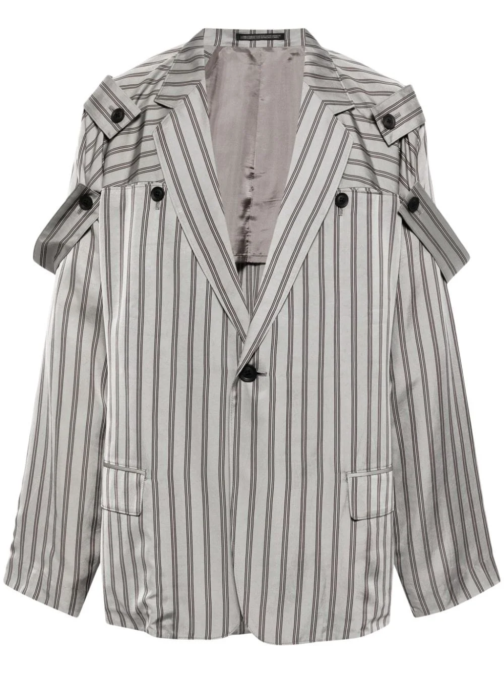 epaulette-detail pinstripe blazer Highlights - Silver/black - Satin finish - Vertical stripe print - Epaulettes - Notched collar - Notched lapels - Long sleeves - Front button fastening - Two side flap pockets - Partial lining Imported Composition Outer: Cupro 100% Lining: Cupro 100% SIZE & FIT Model measurements Height 6 ft 2 in(1.87 m) Bust/Chest 33.07 in(84 cm) Hips 35.43 in(90 cm) Waist 26.77 in(68 cm) FittingInformation Designed for a relaxed fit, this piece allows for comfort and movement when worn Constructed with additional length on the sleeve Made from a lightweight non-stretch fabric This piece fits true to size – take your usual size