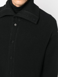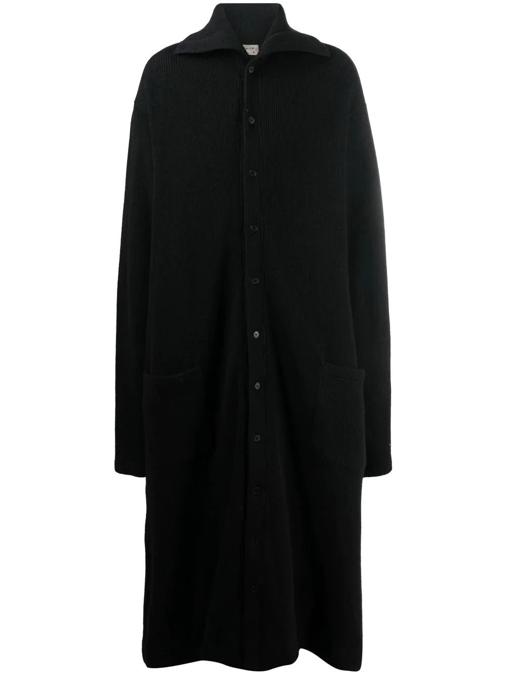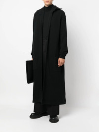 fine-knit ankle-length coat black cotton-wool blend knitted construction fine ribbed pointed flat collar front button fastening ankle-length long sleeves straight hem Imported Composition Wool 56%, Cotton 27%, Nylon 17% SIZE & FIT Model measurements Height 6 ft 2 in(1.87 m) Bust/Chest 36.41 in(92.5 cm) Hips 35.43 in(90 cm) Waist 29.52 in(75 cm) FittingInformation This piece fits true to size. We recommend you get your regular size Cut for a loose fit Made with a mid-weight fabric Washing instructions Dry Clean Only