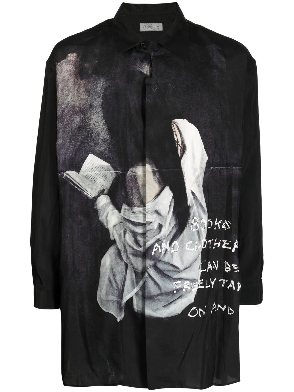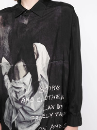 graphic-print long-sleeve shirt black silk graphic print to the front classic collar long sleeves buttoned cuffs Imported Composition Body: Silk 100% SIZE & FIT Model measurements Height 6 ft 2 in(1.87 m) Bust/Chest 36.22 in(92 cm) Hips 37.79 in(96 cm) Waist 28.34 in(72 cm) FittingInformation This piece fits true to size. We recommend you get your regular size Cut for a loose fit Made with a lightweight non-stretch fabric