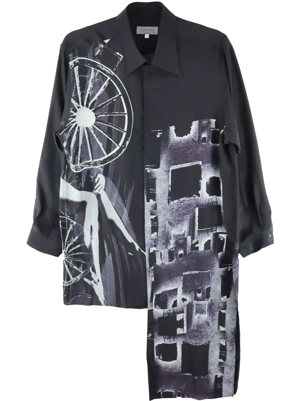 graphic-print overshirt Highlights - Black - Contrasting graphic print - Oversized fit - Classic collar - Front button fastening - Long sleeves - Button cuffs - Side slits - Unique asymmetric design - Stylized imagery Imported Composition Silk 100%