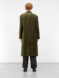 Coat in khaki crushed velvet with a tailored cut, notched lapel, and structured shoulders, finished with surgeon’s cuffs and side flap pockets. Featuring: • Tailored fit • Crushed velvet construction • Notched lapel • Structured shoulders • Long sleeves with surgeon’s cuffs • Front button closure • Chest welt pocket • Side flap pockets • Back vent • Lined • Made in Japan • Main: 50% Rayon 50% Cotton | Lining: 100% Cupro | Inner: 100% Polyester • Japanese sizing Model is 6'3" wearing size 4. Shoulders: 18" Chest: 36" Waist: 28.5"