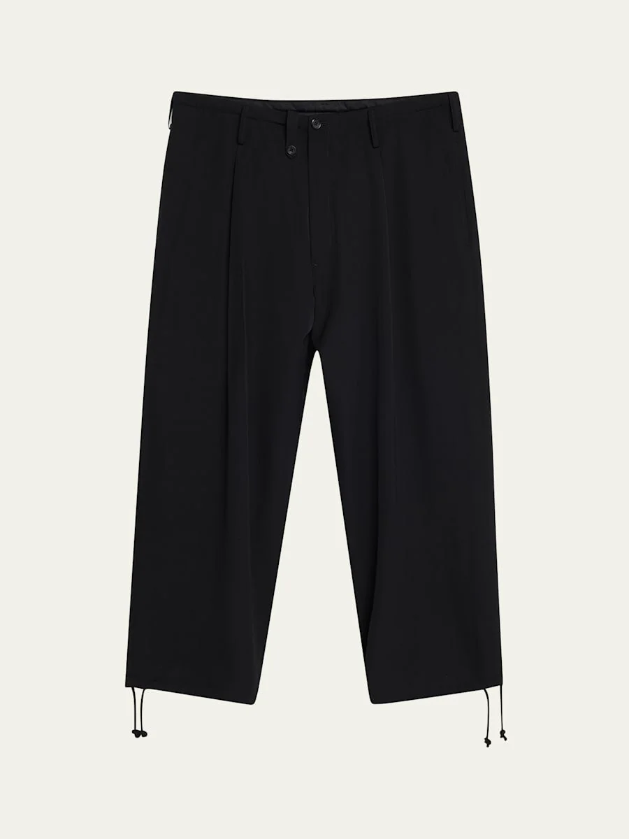 Yohji Yamamoto pants crafted from signature gabardine with a smooth texture and elegant shine Drawstring waist and hems Zip fly with button closure Pleated front In-seam side pockets Buttoned back pockets Full length Wide legs Wool Made in Japan Online Inquiries: BGS21_ND1SX| Store Inquiries: #4996888