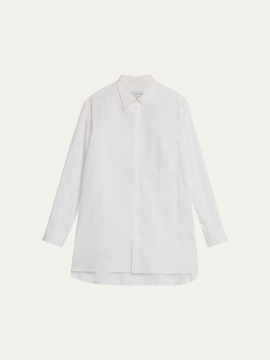 Yohji Yamamoto solid dress shirt crafted from crisp poplin with a smooth handfeel Point collar Button placket Chest patch pocket Long sleeves Squared barrel cuffs Box pleat at back yoke Curved hem Cotton Made in Japan Online Inquiries: BGS21_ND1SN| Store Inquiries: #4996878