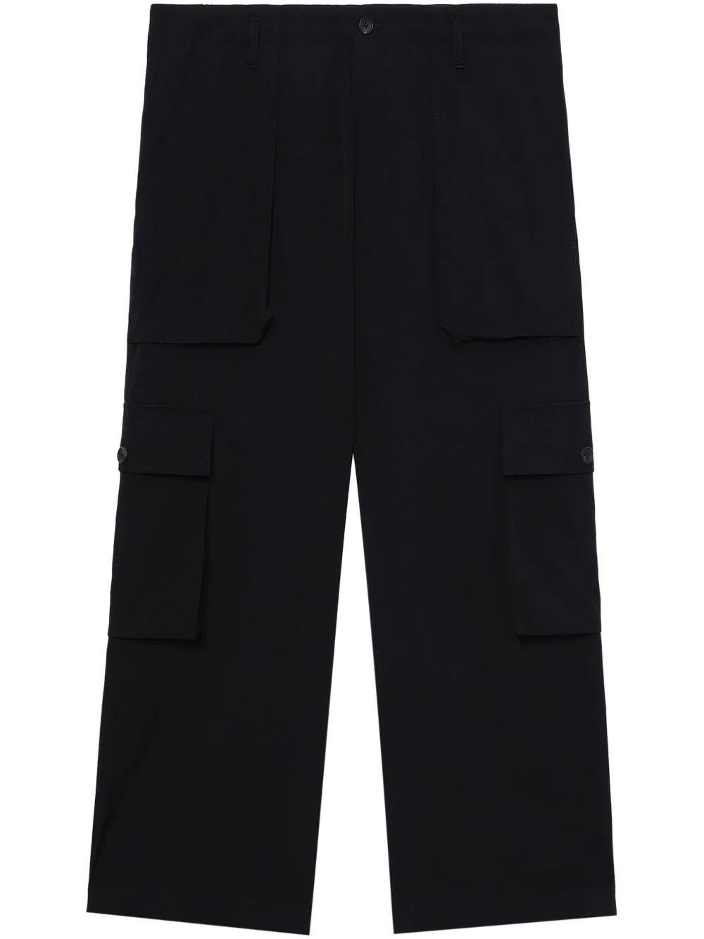 multi-pocket wool trousers Highlights - Black - Front button fastening - Two side patch pockets - Two side cargo pockets - Two rear flap pockets Imported Composition Wool 100%