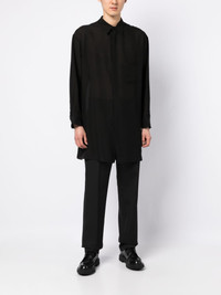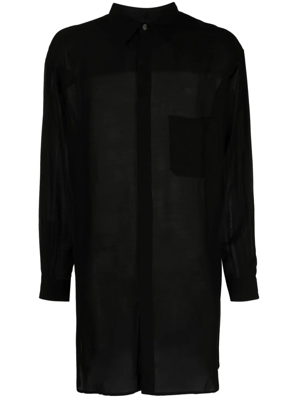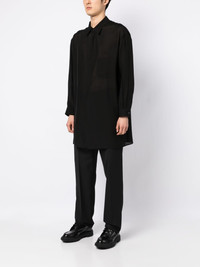 sheer-finish long shirt jet black sheer finish classic collar concealed front fastening long sleeves buttoned-cuff sleeves straight hem Imported Composition Body: Cupro 94%, Silk 6% SIZE & FIT Model measurements Height 6 ft 2 in(1.87 m) Bust/Chest 34.25 in(87 cm) Hips 36.22 in(92 cm) Waist 29.52 in(75 cm) FittingInformation This piece fits true to size. We recommend you get your regular size Cut for a loose fit Made with a mid-weight non-stretch fabric Washing instructions Dry Clean Only