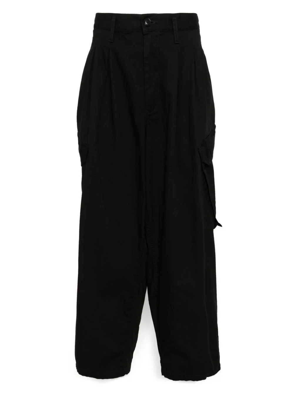 tucked trousers Highlights - Black - Front button and zip fastening - Two side inset pockets - Two side cargo pockets - Two rear welt pockets Imported Composition Cotton 100% SIZE & FIT Model measurements Height 6 ft 2 in(1.88 m) Bust/Chest 34.25 in(87 cm) Hips 34.64 in(88 cm) Waist 26.77 in(68 cm) FittingInformation Designed for a relaxed tapered leg, allowing a comfortable loose fit above the knee with a closer fit towards the calves Made from a midweight non-stretch fabric